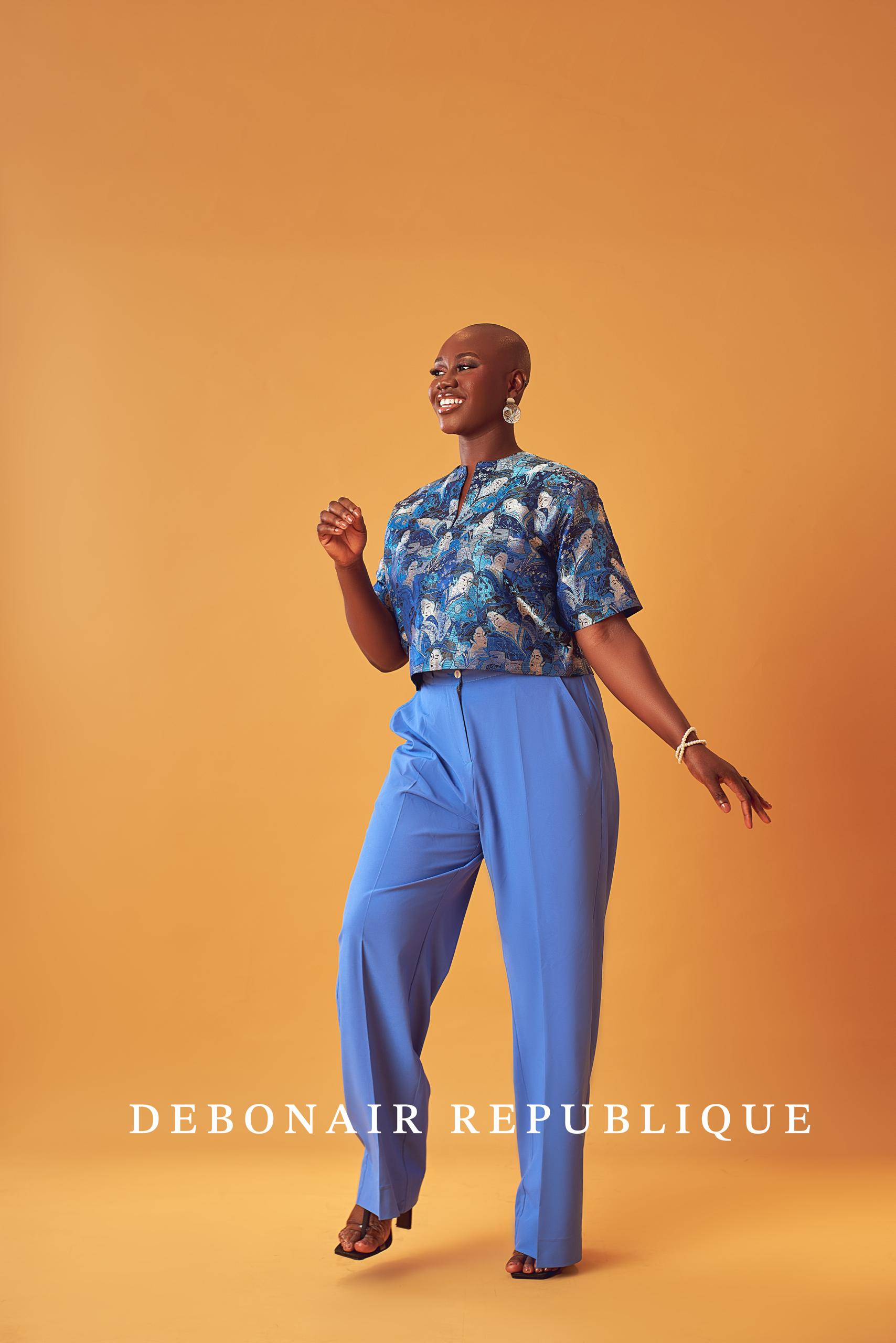 The star of this set is the structured crop top. Crafted from a rich, reflective blue and silver brocade (or jacquard), the fabric is a work of art, featuring a mesmerizing Oriental-inspired motif. The top's clean, short sleeves and minimalist V-split neckline provide a sharp, modern frame for the magnificent print.