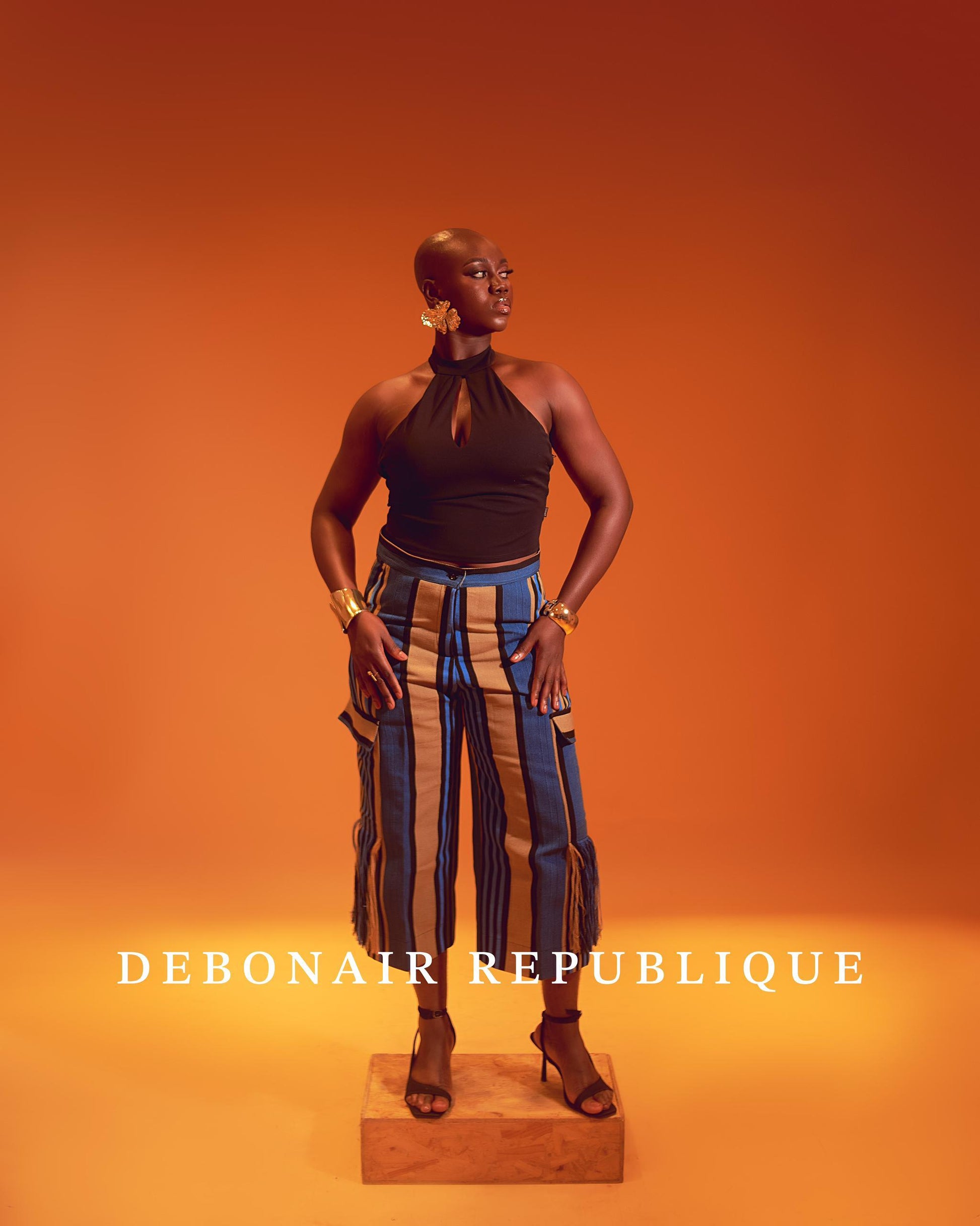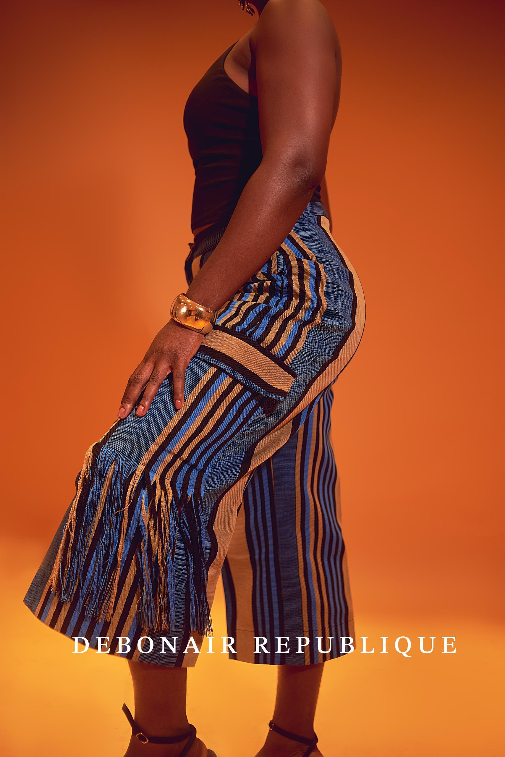 Debonairepublique takes this heritage material and transforms it into a contemporary statement piece. The custom, complex stripe pattern in sienna, black, and dynamic blue highlights the depth of the Aso-oke weave. The final, dramatic touch is the free-flowing fringe hem, which adds playful movement and contrast to the fabric's structure.